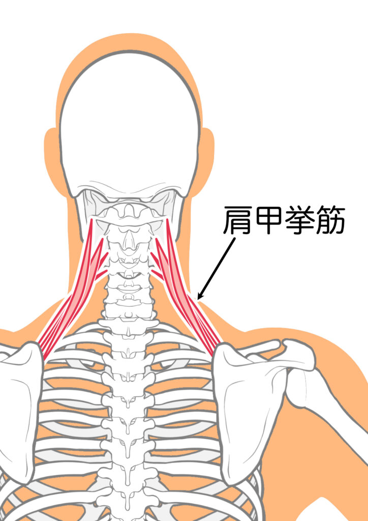 肩甲挙筋は首から肩甲骨につき、肩甲骨を引き上げる、下方回旋に傾ける働きがあります。