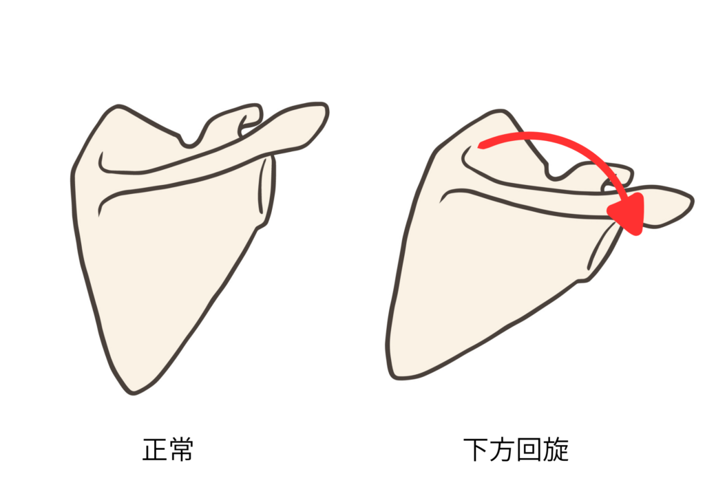 先ほどの説明した肩甲骨の下方回旋が続くと、この肩甲骨は常に縮こまった状態になります。